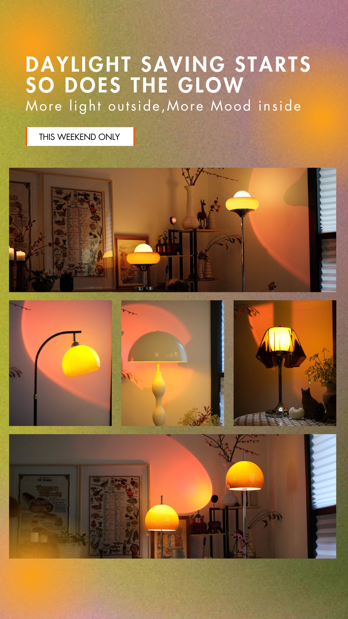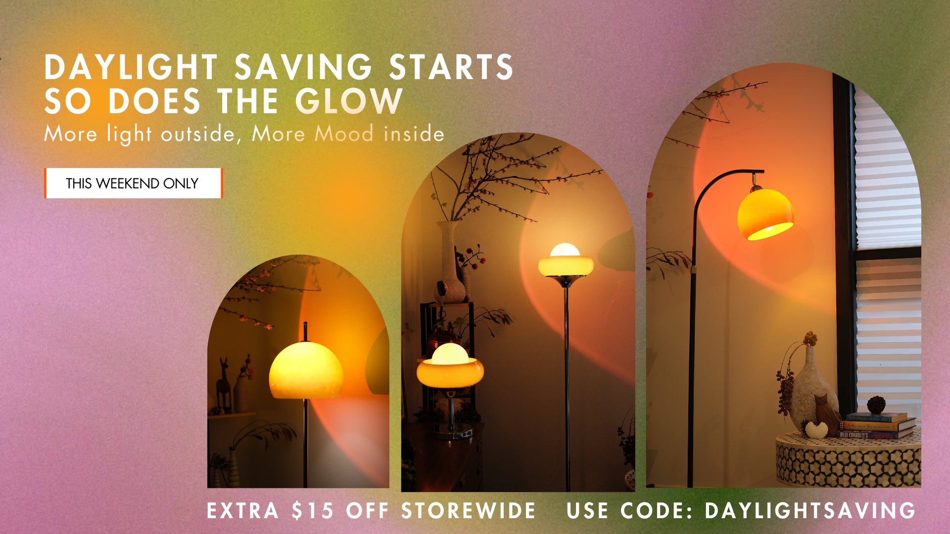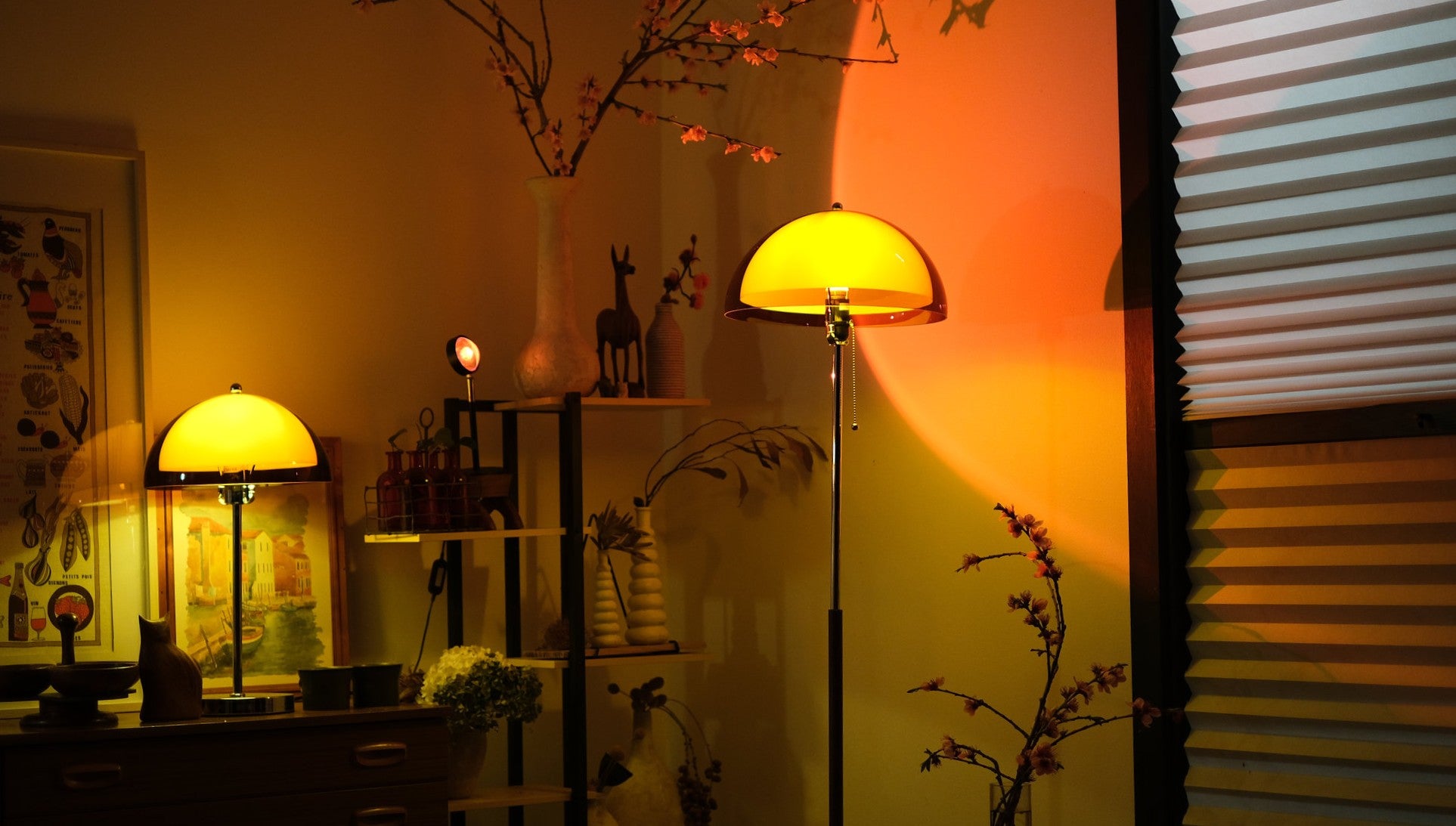Mushroom  Bella Arc Floor lamp with a Glass Yellow Orange Gradient shade in a dimly lit room.