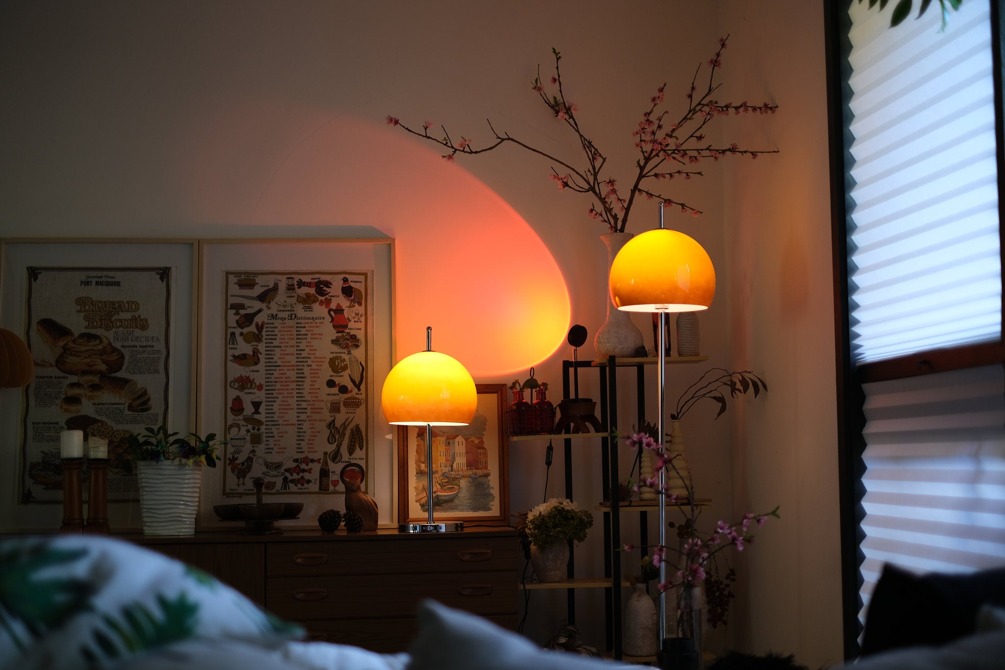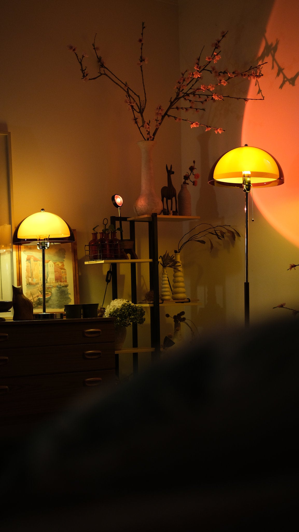 Coby+ Mushroom Bauhaus Floor Lamp Orange with Pull Chain against a warm-toned wall with decorative elements.