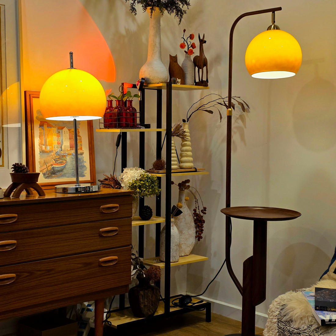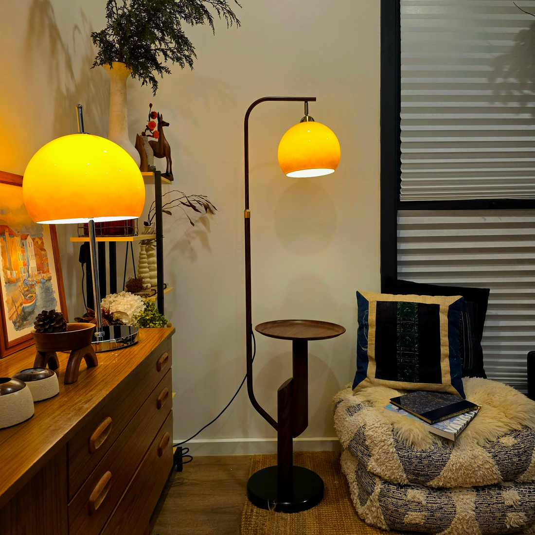 Bring warmth, character, and designer flair into your home with this stunning vintage-inspired lamp set, featuring the Carla Arc Floor Lamp and the Olivia Mushroom Table Lamp. Together, they blend Bauhaus beauty, mid-century modern style, and clever functionality — perfect for interiors that value both form and function.