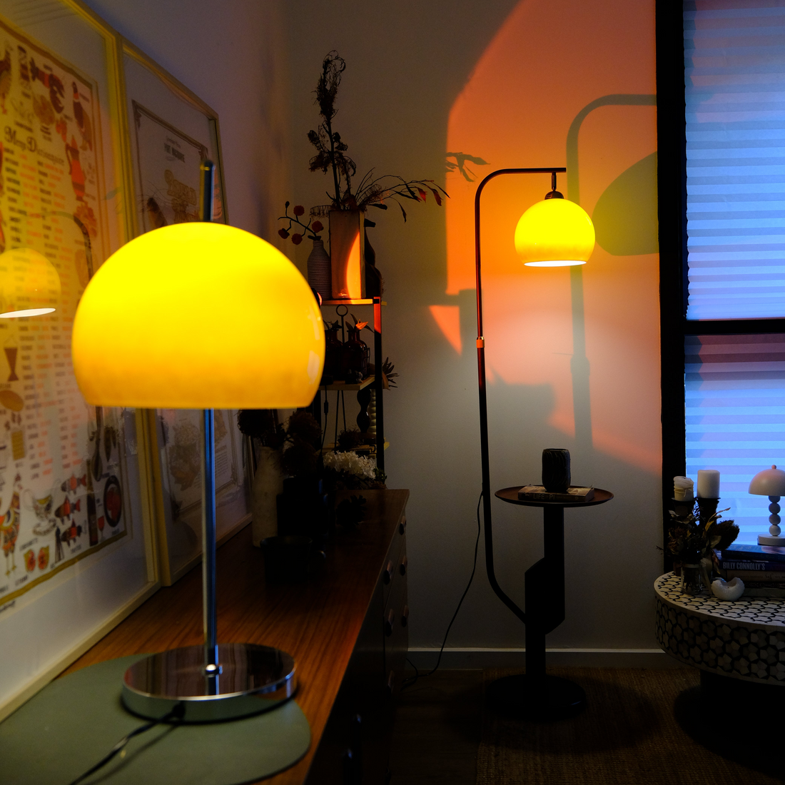 A nod to classic Bauhaus and 70s modernism, Olivia’s amber glass dome and polished chrome base create a sculptural accent that glows with soft, ambient light.