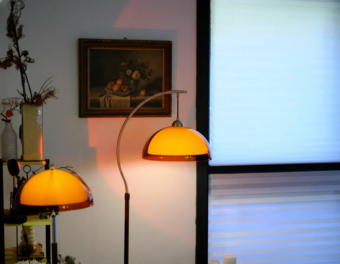 Featuring the iconic Coby arc floor lamp with optional shelf and the matching double dome table lamp, this set brings retro charm, soft ambience and everyday functionality into one effortless combination. A simple way to elevate your space, one soft glow at a time.