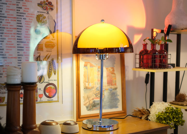 Channel the bold spirit of 70s design with the Coby Double Dome Mushroom Table Lamp — a compact yet eye-catching piece that blends Bauhaus-inspired structure with nostalgic retro vibes. Featuring a sculptural double-layer acrylic dome in rich orange and white, this lamp delivers a soft, ambient glow that adds instant character to your bedside table, desk, or reading nook.