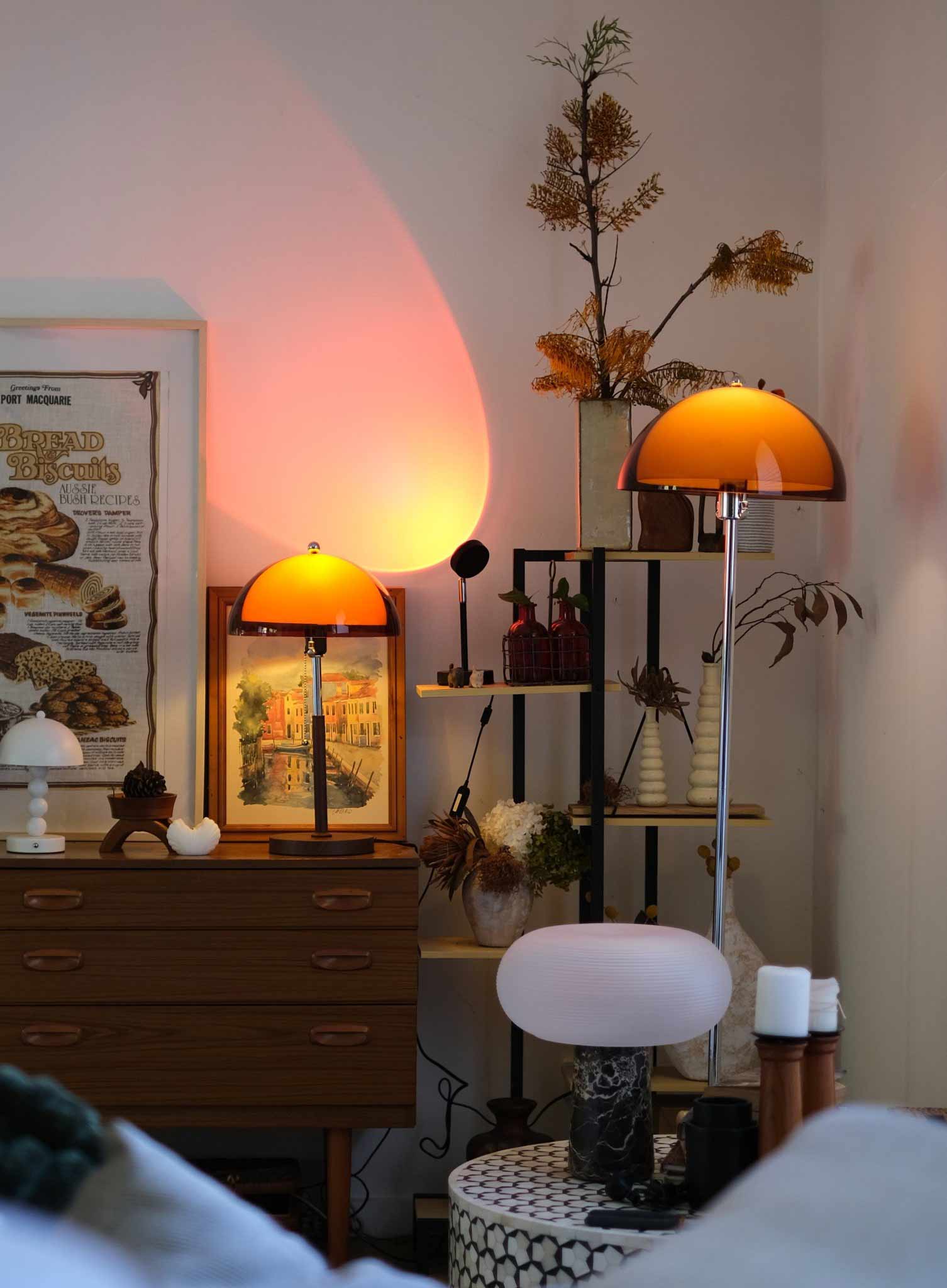 A retro table lamp with an opal glass shade and amber acrylic ring.