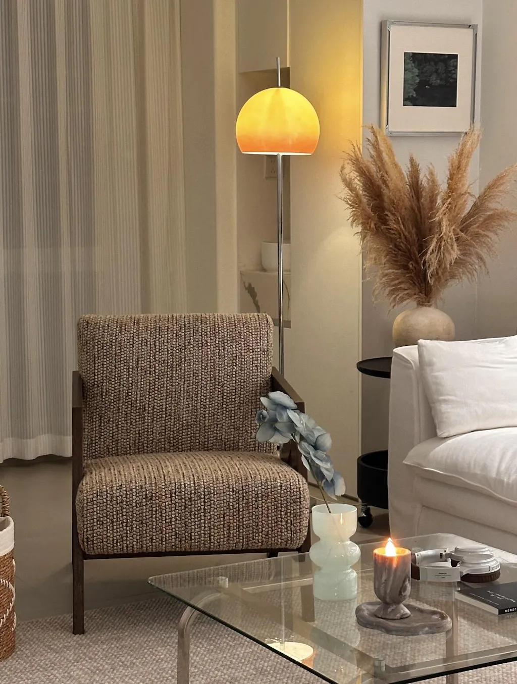 - Golden Ambient Glow – Amber glass shade creates cozy, mood-enhancing lighting